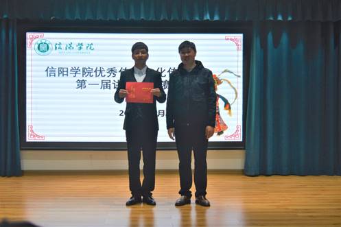 本次比赛经过前期初赛、预赛,最终十七位同学进入决赛,他们分布来自不同学院、专业的选手。比赛中,为保证公平、公正、公开原则,每隔六位参赛者就现场公布一次成绩。每位参赛选手都精心准备,制作精美PPT,内容丰富,讲解颇具自己的专业特色,他们仪表端正、大方,声音抑扬顿挫,语调激昂,充分展示了信阳优秀传统文化的魅力,真切表达了自己对信阳优秀传统文化的热爱,讲解氛围感染着在场的每一位观众。最终,郝灵辉荣获一等奖;孟菲、薛雅文、宋汉熙、柴涵博三位同学荣获二等奖;王珂、何思颐、窦梓菲、谢静洋、于雯鑫奖五位同学荣获三等;其他七位获得优秀奖。与会老师和分布为他们进行颁奖。