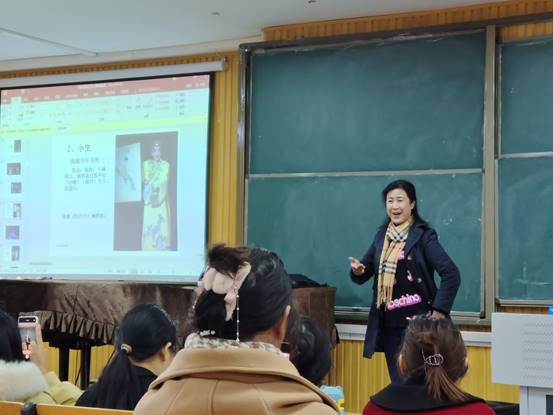 课堂上,何雪林老师详细介绍信阳地方的花篮戏、花鼓戏、皮影戏、嗨字戏、地灯戏、灶戏等戏曲艺术特征和表演形式。何老师通过现场讲解、自身示范、师生互动等多种形式介绍了戏曲中的角色、行当、唱腔、服饰以及伴奏乐器等知识,用把趣味性、知识性、参与性融于一体的形式,深深吸引了现场所有的学生。互动环节,何老师与学生们一起唱念做打,同学们一招一式学的有模有样,同学们连声鼓掌叫好,课堂气氛十分融洽。