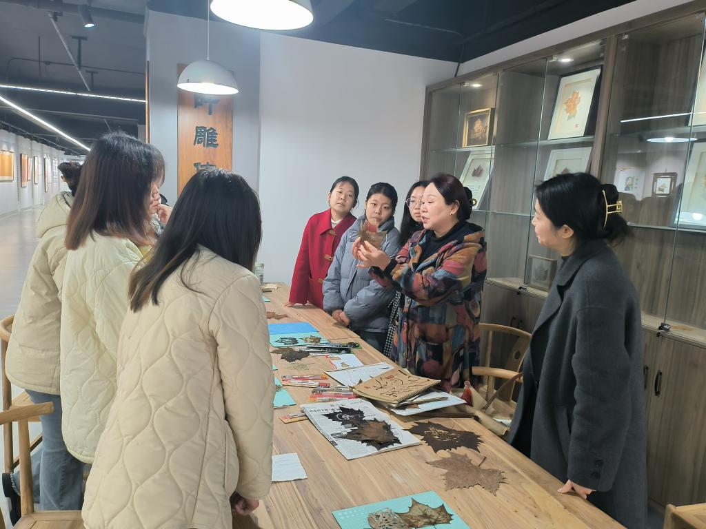 牛丽薇老师从商城叶雕的由来、选材、艺术创作特点、叶雕与剪纸的关系、叶雕的叶子处理、雕刻方法、传承现状等方面内容进行了详细阐述,并现场教授同学们叶雕技法,同学们学习认真,牛老师与同学们在传承馆叶雕传习区进行现场制作,她结合自己的叶雕学习经历与同学们进行了交流。现场领导老师对下一步叶雕传习社的建设提出了很好的意见和建议。牛老师鼓励同学们认真专研与学习叶雕,希望商城叶雕非遗项目能在信阳学院生根发芽,为丰富校园文化建设贡献力量。