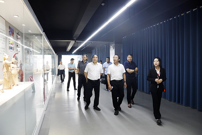 传承馆讲解员详细介绍了传承馆的建设和取得的文化传承成效。于长立组长一行先后参观视频、皮影制作、歌舞戏曲、信阳毛尖制作与炒制、剪纸、烙画、文创产品等传承区域,高度赞扬我校对信阳优秀传统文化传承馆建设及取得育人成效。