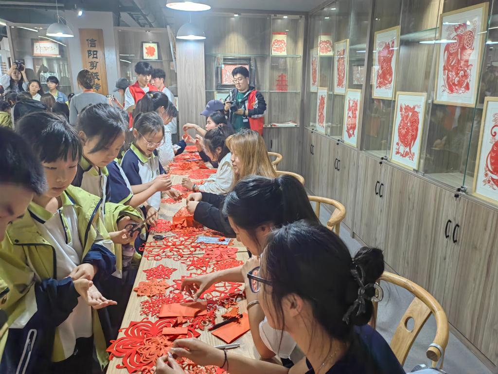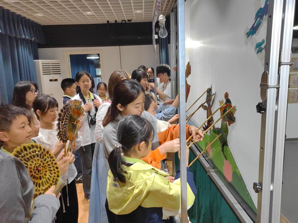 活动现场,馆内讲解员们为他们讲述着文物背后的故事,同学们认真聆听,踊跃提问,在互动交流中加深了对信阳历史文化的理解。随后,带来了精彩的皮影戏表演《小猫米罗》,灵动的角色、伴随着生动的配音,孩子们在光影交错间领略了传统艺术的独特魅力。此外,活动还设置了剪纸、皮影制作、烙画等非遗体验环节,在传习社同学的指导下,小学生们亲手制作剪纸作品,体验皮影、烙画制作,感受到了传统文化的魅力和乐趣。